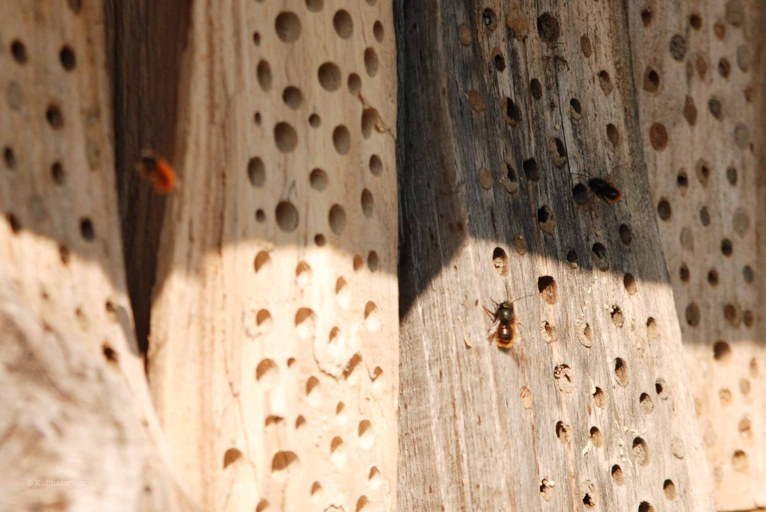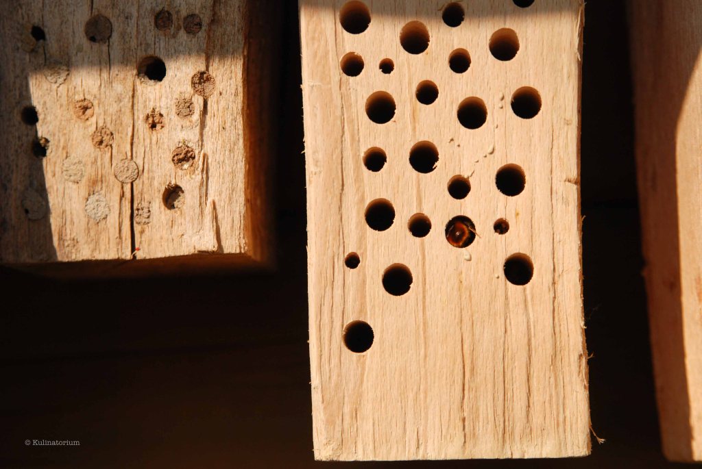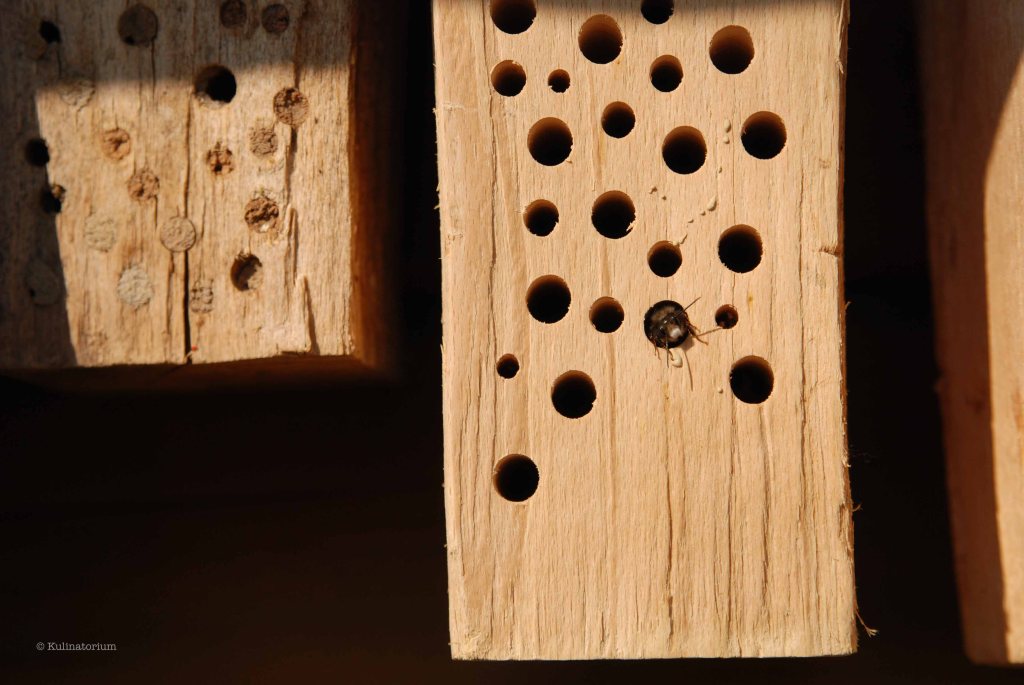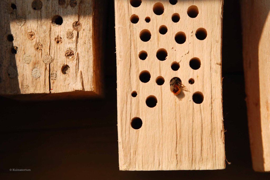 Mauerbienen: Diese behaarten Wildbienen sind eine der ersten aktiven Bienen im Jahr. Die im Vorjahr in die Liniennester gelegten Larven werden in Kammern mit Futter versorgt, verpuppen sich im Herbst und warten dann auf den Frühling, um zu schlüpfen. Die Männchen schlüpfen im Schnitt 2 Wochen vor den Weibchen und machen sich schon auf die Nestsuche für das neue Jahr. Sind auch die Weibchen geschlüpft, geht das Ganze wieder von vorne los. Nisthilfen können sie dabei sehr unterstützen – zum Beispiel in Form von in Holz gebohrten Gängen von 4-8 mm Durchmesser und einer Länge von mindestens 10 cm (je länger, desto besser). Selber machen ist besser als kaufen, da diese nicht immer ideal konzipiert sind, weiß ich vom Hofmeister. Wer sich mehr damit beschäftigen will, dem sei diese Seite empfohlen.